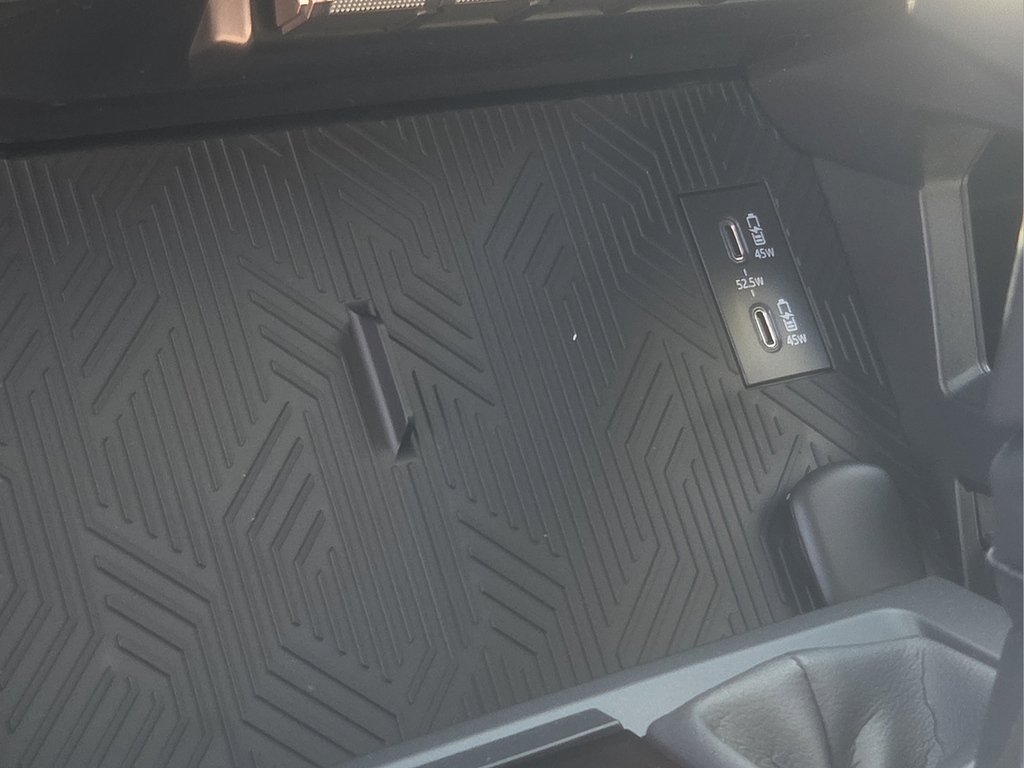 Dual illuminated rear center console-mounted USB charging ports.
